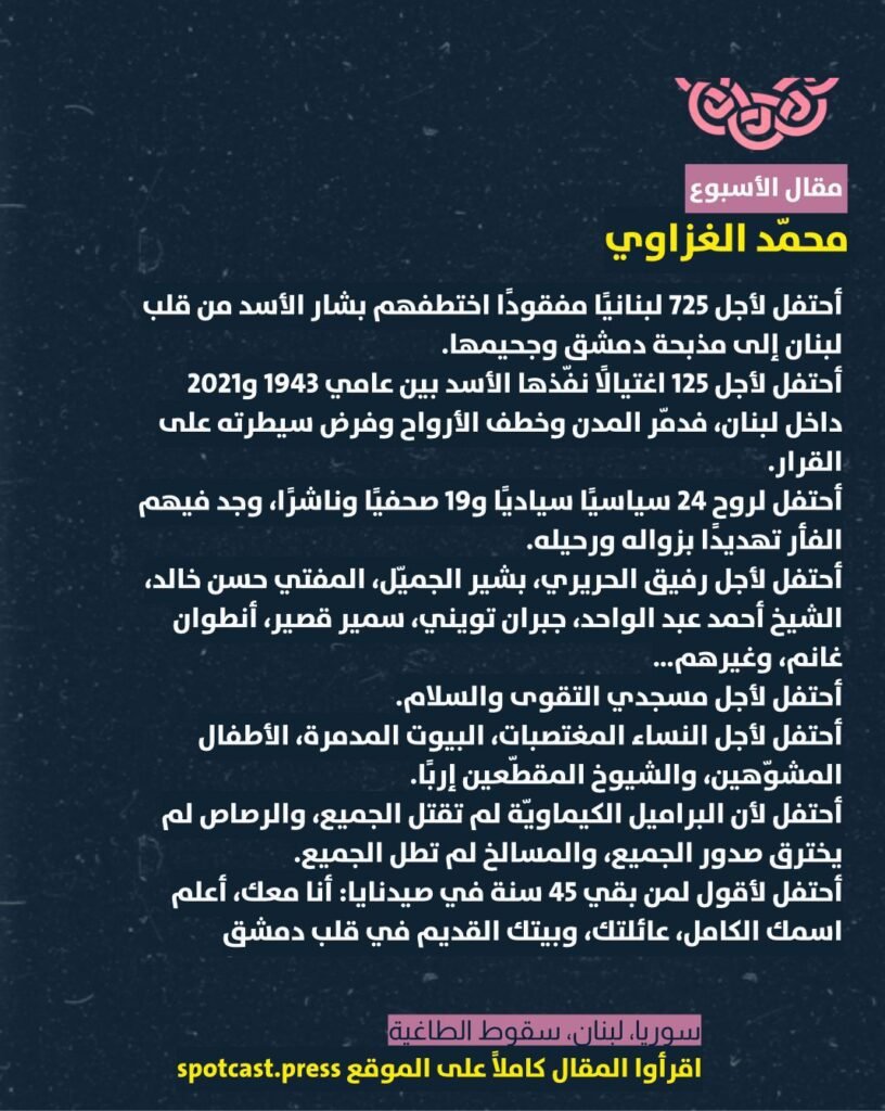 أحتفل لأجل 125 اغتيالًا نفّذها الأسد بين عامي 1943 و2021 داخل لبنان، فدمّر المدن وخطف الأرواح وفرض سيطرته على القرار.